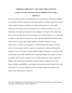We discuss family firm longevity building upon a new conceptual lens, informed by transaction cost economics (TCE), but augmented with corporate diplomacy thinking. Family firms, because of their superior foundation of bonding social capital (interpreted here as a firm-specific, transaction cost-reducing governance mechanism), have an intrinsic advantage vis-à-vis nonfamily firms with regards to utilizing network ties supportive of longevity. Most family firms, however, fail to leverage effectively this governance tool to achieve longevity, due to bifurcation bias (BB), that is, the unchecked prioritization of assets and relationships that hold affective value for the family. We propose that corporate diplomacy, through its three process steps, familiarization, acceptance, and engagement, can help the family firm augment its baseline reservoir of social capital, and allows improved economizing on contracting challenges that endanger its survival. Externally, corporate diplomacy helps economizing on expressions of BB in relationships with outside stakeholders, thus augmenting bridging social capital. Internally, it can address biased treatment of family versus nonfamily human assets, thereby augmenting bonding social capital. Intergenerationally, corporate diplomacy supports access to, and improved reliance upon the firm’s social capital by next generation family members. The family firms that focus on corporate diplomacy processes and the resulting social capital creation greatly improve their chances of longevity.
