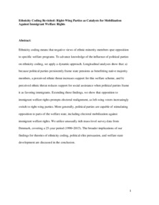 Ethnicity coding means that threat-based views of ethnic minority members spur opposition to specific welfare programmes. To advance knowledge of the influence of political parties on ethnicity coding, we apply a dynamic approach. Longitudinal analyses show that: a) because right-wing political parties persistently frame state pensions as benefitting native majority members, a perceived ethnic threat increases support for this welfare scheme, and b) a perceived ethnic threat reduces support for social assistance when right-wing political parties frame it as favouring immigrants. Extending these findings, we show that opposition to immigrant welfare rights prompts electoral realignment, as left-wing voters increasingly switch to right-wing parties. More generally, political parties are capable of stimulating opposition to parts of the welfare state, including electoral mobilization against immigrant welfare rights. We utilize unusually rich mass-level survey data from Denmark, covering a 25-year period (1990‒2015). The broader implications of our findings for theories of ethnicity coding, political elite persuasion, and welfare state development are discussed in the conclusion.