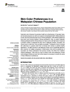 Kok Wei, T. and Stephen, I. D. (2019) Skin color preferences in a Malaysian Chinese population. Frontiers in Psychology, 10. 1352. ISSN 1664-1078 doi: 10.3389/fpsyg.2019.01352