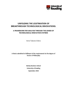 Talvera Fabra, I. (2019) Unfolding the legitimation of breakthrough technological innovations: a framework for analysis through the lenses of technological innovation systems. PhD thesis, University of Reading. doi: 10.48683/1926.00084760