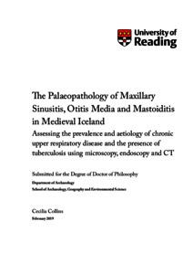 Collins, C. (2019) The palaeopathology of maxillary sinusitis, otitis media and mastoiditis in Medieval Iceland: assessing the prevalence and aetiology of chronic upper respiratory disease and the presence of tuberculosis using microscopy, endoscopy and CT. PhD thesis, University of Reading. doi: 10.48683/1926.00084764