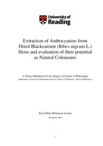 Mohamad Azman, E. B. (2019) Extraction of anthocyanins from dried blackcurrant (Ribes nigrum L.) skins and evaluation of their potential as natural colourants. PhD thesis, University of Reading. doi: 10.48683/1926.00084821
