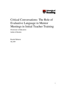 Roberts, R. (2019) Critical conversations: the role of evaluative language in mentor meetings in initial teacher training. PhD thesis, University of Reading. doi: 10.48683/1926.00084859