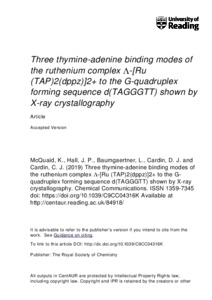 Three thymine/adenine binding modes of the ruthenium complex Λ-[Ru (TAP)2(dppz)]2+ to the G-quadruplex forming sequence d(TAGGGTT) shown by X-ray crystallography.