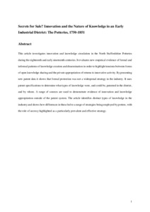 This article investigates innovation and knowledge circulation in the North Staffordshire Potteries during the eighteenth and early nineteenth centuries. It evaluates new empirical evidence of formal and informal patterns of knowledge creation and dissemination in order to highlight tensions between forms of open knowledge sharing and the private appropriation of returns to innovative activity. By presenting new patent data it shows that formal protection was not a widespread strategy in the industry. It uses patent specifications to determine what types of knowledge were, and could be, patented in the district, and by whom. A range of sources are used to demonstrate evidence of innovation and knowledge appropriation outside of the patent system. The article identifies distinct types of knowledge in the industry and shows how differences in these led to a range of strategies being employed by potters, with the role of secrecy highlighted as a particularly prevalent and effective strategy.