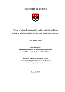 Barnes, R. H. (2019) Mode of action of organic acids against bacterial foodborne pathogens and investigation of improved disinfection methods. PhD thesis, University of Reading. doi: 10.48683/1926.00085033