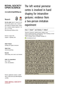 Reader, A. T. and Holmes, N. (2018) The left ventral premotor cortex is involved in hand shaping for intransitive gestures: evidence from a two-person imitation experiment. Royal Society Open Science, 5 (10). 181356. ISSN 2054-5703 doi: 10.1098/rsos.181356