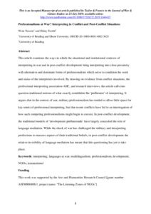 This article examines the ways in which the situational and institutional contexts of interpreting in war and in post-conflict development bring interpreting into close proximity with alternative and dominant forms of professionalism which serve to condition the work and status of the interpreters involved. By drawing on evidence from conflict situations, the professional interpreting association AIIC, and research interviews, the article questions traditional notions of what constitutes the ‘profession’ of interpreting. It argues that in the context of war, military professionalism has tended to allow little space for key tenets of professional interpreting, but that recent conflicts have led to an interrogation of how such competing professionalisms might begin to coexist. In post-conflict development, on the other hand, the traditional models of ‘development professionals’ have largely concealed the role of language mediation, and this relative invisibility has meant that a similar interrogation on competing professionalisms has yet to take place.