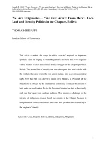 Grisaffi, T. (2010) We are originarios…‘We just aren't from here’: Coca leaf and identity politics in the Chapare, Bolivia. Bulletin of Latin American Research, 29 (4). pp. 425-439. ISSN 0261-3050 doi: 10.1111/j.1470-9856.2010.00385.x