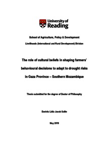 Salite, D. L. J. (2019) The role of cultural beliefs in shaping farmers' behavioural decisions to adapt to drought risks in Gaza Province - Southern Mozambique. PhD thesis, University of Reading. doi: 10.48683/1926.00085433