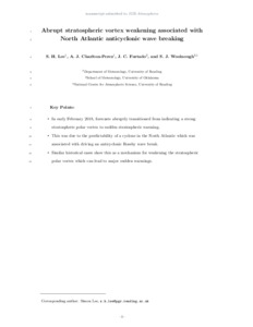Lee, S. H., Charlton-Perez, A. ORCID: https://orcid.org/0000-0001-8179-6220, Furtado, J. C. and Woolnough, S. ORCID: https://orcid.org/0000-0003-0500-8514 (2019) Abrupt stratospheric vortex weakening associated with North Atlantic anticyclonic wave breaking. Journal of Geophysical Research: Atmospheres, 124 (15). pp. 8563-8575. ISSN 2169-897X doi: 10.1029/2019JD030940
