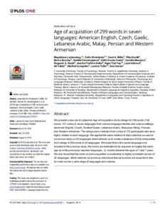 Łuniewska, M., Wodniecka, Z., Miller, C. A., Smolík, F., Butcher, M., Chondrogianni, V., Hreich, E. K., Messarra, C., A. Razak, R., Treffers-Daller, J. ORCID: https://orcid.org/0000-0002-6575-6736, Yap, N. T., Abboud, L., Talebi, A., Gureghian, M., Tuller, L. and Haman, E. (2019) Age of acquisition of 299 words in seven languages: American English, Czech, Gaelic, Lebanese Arabic, Malay, Persian and Western Armenian. PLoS ONE, 14 (8). e0220611. ISSN 1932-6203 doi: 10.1371/journal.pone.0220611