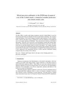 Maynard, C. M. and Walters, D. N. (2019) Mixed-precision arithmetic in the ENDGame dynamical core of the Unified model, a numerical weather prediction and climate model code. Computer Physics Communications, 244. pp. 69-75. ISSN 0010-4655 doi: 10.1016/j.cpc.2019.07.002