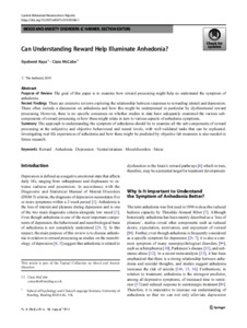 Kaya, S. and McCabe, C. ORCID: https://orcid.org/0000-0001-8704-3473 (2019) Can understanding reward help illuminate anhedonia? Current Behavioral Neuroscience Reports, 6. pp. 236-242. ISSN 2196-2979 doi: 10.1007/s40473-019-00186-1