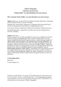 | Uncontrolled Keywords | Diverse family troubles; children's and young people's family lives; time-space practices of care; relationality; family geographies. |