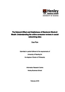 Pan, X. (2019) The network effect and helpfulness of electronic word-of-mouth: understanding the online consumer reviews in social networking sites. PhD thesis, University of Reading. doi: 10.48683/1926.00086002