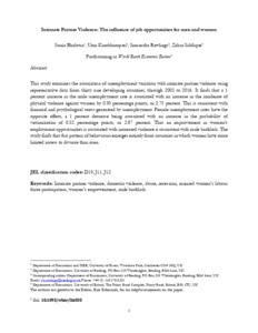 This study examines the association of unemployment variation with intimate partner violence using representative data from thirty one developing countries, through 2005 to 2016. It finds that a 1 percent increase in the male unemployment rate is associated with an increase in the incidence of physical violence against women by 0.50 percentage points, or 2.75 percent. This is consistent with financial and psychological stress generated by unemployment. Female unemployment rates have the opposite effect, a 1 percent decrease being associated with an increase in the probability of victimization of 0.52 percentage points, or 2.87 percent. That an improvement in women’s employment opportunities is associated with increased violence is consistent with male backlash. The study finds that this pattern of behaviours emerges entirely from countries in which women have more limited access to divorce than men.