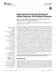 Yu, K., Anderegg, J., Mikaberidze, A., Karisto, P., Mascher, F., McDonald, B. A., Walter, A. and Hund, A. (2018) Hyperspectral canopy sensing of wheat septoria tritici blotch disease. Frontiers in Plant Science, 9. 1195. ISSN 1664-462X doi: 10.3389/fpls.2018.01195