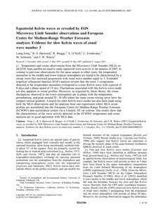Feng, L., Harwood, R., Brugge, R., O'Neill, A., Froidevaux, L., Schwartz, M. and Waters, J. (2007) Equatorial Kelvin waves as revealed by EOS Microwave Limb Sounder observations and European Centre for Medium-Range Weather Forecasts analyses: Evidence for slow Kelvin waves of zonal wave number 3. Journal of Geophysical Research - Atmospheres, 112 (D16). D16106. ISSN 0148-0227 doi: 10.1029/2006JD008329