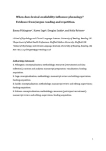 Pilkington, E., Sage, K., Saddy, D. and Robson, H. (2019) What can repetition, reading and naming tell us about Jargon Aphasia? Journal of Neurolinguistics, 49. pp. 45-56. ISSN 0911-6044 doi: https://doi.org/10.1016/j.jneuroling.2018.08.003