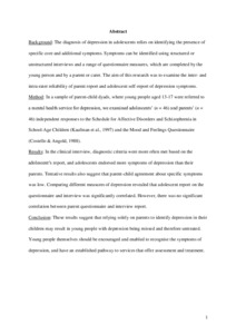 Background: The diagnosis of depression in adolescents relies on identifying the presence of specific core and additional symptoms. Symptoms can be identified using structured or unstructured interviews and a range of questionnaire measures, which are completed by the young person and by a parent or carer. The aim of this research was to examine the inter- and intra-rater reliability of parent report and adolescent self-report of depression symptoms. Method: In a sample of parent-child dyads, where young people aged 13-17 were referred to a mental health service for depression, we examined adolescents’ (n = 46) and parents’ (n = 46) independent responses to the Schedule for Affective Disorders and Schizophrenia in School-Age Children (Kaufman et al., 1997) and the Mood and Feelings Questionnaire (Costello & Angold, 1988). Results: In the clinical interview, diagnostic criteria were more often met based on the adolescent’s report, and adolescents endorsed more symptoms of depression than their parents. Tentative results also suggest that parent-child agreement about specific symptoms was low. Comparing different measures of depression revealed that adolescent report on the questionnaire and interview was significantly correlated. However, there was no significant correlation between parent questionnaire and interview report. Conclusion: These results suggest that relying solely on parents to identify depression in their children may result in young people with depression being missed and therefore untreated. Young people themselves should be encouraged and enabled to recognise the symptoms of depression, and have an established pathway to services that offer assessment and treatment.
