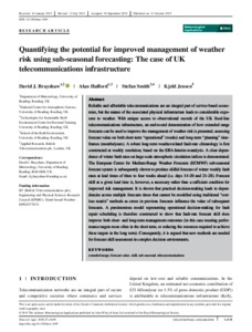 Brayshaw, D. J. ORCID: https://orcid.org/0000-0002-3927-4362, Halford, A., Smith, S. ORCID: https://orcid.org/0000-0002-5053-4639 and Kjeld, J. (2020) Quantifying the potential for improved management of weather risk using subseasonal forecasting: the case of UK telecommunications infrastructure. Meteorological Applications, 27 (1). e1849. ISSN 1469-8080 doi: 10.1002/met.1849