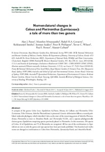 Paton, A., Mwyanyambo, M., Govaerts, R. H.A., Smitha, K., Suddee, S., Phillipson, P. B., Wilson, T. C., Forster, P. I. and Culham, A. ORCID: https://orcid.org/0000-0002-7440-0133 (2019) Nomenclatural changes in Coleus and Plectranthus (Lamiaceae): a tale of more than two genera. PhytoKeys, 129. pp. 1-158. ISSN 1314–2003 doi: 10.3897/phytokeys.129.34988