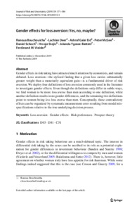 Bouchouicha, R., Deer, L., Eid, A. G., McGee, P., Schoch, D., Stojic, H., Ygosse-Battisti, J. and Vieider, F. M. (2019) Gender effects for loss aversion: yes, no, maybe? Journal of Risk and Uncertainty, 59. pp. 171-184. ISSN 0895-5646 doi: 10.1007/s11166-019-09315-3
