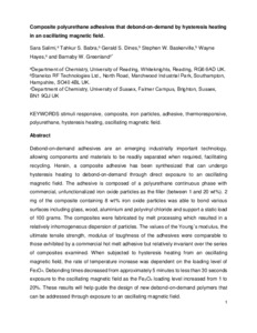 Salimi, S., Babra, T. S., Dines, G., Baskerville, S. W., Hayes, W. ORCID: https://orcid.org/0000-0003-0047-2991 and Greenland, B. (2019) Composite polyurethane adhesives that debond-on-demand by hysteresis heating in an oscillating magnetic field. European Polymer Journal, 121. 109264. ISSN 0014-3057 doi: 10.1016/j.eurpolymj.2019.109264