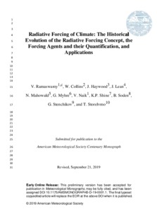 Ramaswamy, V., Collins, W., Haywood, J., Lean, J., Mahowald, N., Myhre, G., Naik, V., Shine, K. P. ORCID: https://orcid.org/0000-0003-2672-9978, Soden, B., Stenchikov, G. and Storelvmo, T. (2019) Radiative forcing of climate: the historical evolution of the radiative forcing concept, the forcing agents and their quantification, and applications. Meteorological Monographs, 59. 14.1-14.101. ISSN 0065-9401 doi: 10.1175/AMSMONOGRAPHS-D-19-0001.1