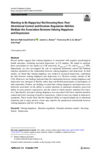 Mahmoodi Kahriz, B., Bower, J. L., Glover, F. M. G. Q. and Vogt, J. ORCID: https://orcid.org/0000-0002-3178-2805 (2020) Wanting to be happy but not knowing how: poor attentional control and emotion-regulation abilities mediate the association between valuing happiness and depression. Journal of Happiness Studies, 21. pp. 2583-2601. ISSN 1573-7780 doi: 10.1007/s10902-019-00193-9