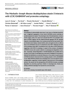 Herzog, L. K., Kevei, É. ORCID: https://orcid.org/0000-0002-0560-9208, Marchante, R., Böttcher, C., Bindesbøll, C., Lystad, A. H., Pfeiffer, A., Gierisch, M. E., Salomons, F. A., Simonsen, A., Hoppe, T. and Dantuma, N. P. (2020) The Machado–Joseph disease deubiquitylase ataxin‐3 interacts with LC3C/GABARAP and promotes autophagy. Aging Cell, 19 (1). e13051. ISSN 1474-9718 doi: 10.1111/acel.13051