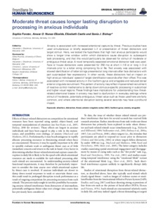 Forster, S., Nunez-Elizalde, A. O., Castle, E. and Bishop, S. J. (2014) Moderate threat causes longer lasting disruption to processing in anxious individuals. Frontiers in Human Neuroscience, 8. 626. ISSN 1662-5161 doi: 10.3389/fnhum.2014.00626