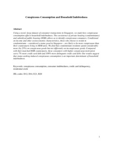 Using a novel, large dataset of consumer transactions in Singapore, we study how conspicuous consumption affects household indebtedness. The coexistence of private housing (condominiums) and subsidized public housing (HDB) allows us to identify conspicuous consumers. Conditional on income and other socioeconomic characteristics, those who choose to reside in condominiums – considered a status good in Singapore – are likely to be more conspicuous than their counterparts living in HDB units. We find that condominium residents spend considerably more (by 25%) on conspicuous goods but not differently on inconspicuous goods. Compared with their matched HDB counterparts, these consumers with higher conspicuous motivation carry 7% more credit card debt and 108% more delinquent credit card debt. Our results suggest that status-seeking-induced conspicuous consumption is an important determinant of household indebtedness.