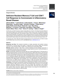 Noble, A., Durant, L., Hoyles, L., McCartney, A. L., Man, R., Segal, J., Costello, S. P., Hendy, P., Reddi, D., Bouri, S., Lim, D. N. F., Pring, T., O’Connor, M. J., Datt, P., Wilson, A., Arebi, N., Akbar, A., Hart, A. L., Carding, S. R. and Knight, S. C. (2020) Deficient resident memory T-cell and Cd8 T-cell response to commensals in inflammatory bowel disease. Journal of Crohn's and Colitis, 14 (4). pp. 525-537. ISSN 1876-4479 doi: 10.1093/ecco-jcc/jjz175