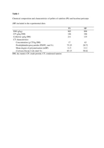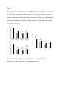 The aim of this study was to evaluate the in vitro rumen fermentation parameters of diets including pellets of sainfoin pellets and/or hazelnut pericarps, which are two plant resources that containing different types of condensed tannins (CT) with contrasted structures, using a batch culture system during for 24 h. The treatments were a basal diet (control), the basal diet + pellets of dehydrated sainfoin (PS), the basal diet + freeze-dried hazelnut pericarps (HP), and the basal diet + PS + HP. The diets were adjusted to be isotannic (20 g/kg dry matter (DM), except for the control) and isoproteic (132 g/kg DM). Total gas and methane (CH4) productions were measured after 3.5 h and 24 h of incubation. At the end of incubation, pH, in vitro DM degradability (IVDMD) and the concentration of fermentation end-products in the medium were also measured. The CT structures of CT infrom PS and HP were very different: as PS showed a PD-dominant profilehad mostly prodelphinidins and HP showed a PC-dominant profile mostly procyanidins. After 24 h of incubation, the total gas and methane productions and IVDMD were greater for the basal diet than for the diet + HP and the diet + PS (P<0.05). The CH4 production increased significantly with the diet + HP in the presence of PEG, a compound CT-inactivating CTcompound (P<0.001), and tended to increase for the diet + PS (P<0.1). The volatile fatty acids (VFA) net productions were globally similar among treatments, while the NH3 concentration was lower for the diet + PS (with a significant PEG effect) than for the diets including HP, and was the highest for the basal diet. It was concluded that the inclusion of PS and HP in a basal diet results in lower rumen fermentability and that but their CT decreased CH4 production and protein degradability;, PS being were more efficient effective than HP for the latterreducing protein degradability.