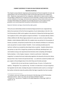 This chapter surveys feminist responses to the enactment of formal recognition of same-sex relationships in the Civil Partnership Act 2004 and the Marriage (Same Sex Couples) Act 2013. Responses are grouped into four categories: celebrations of equal access to rights and privileges; celebrations of acceptance and full citizenship; critiques of state intervention and the institution of marriage; and claims (and responses to those claims) that same sex marriage will be better than opposite sex marriage because it is more equal and less gendered, and could bring about the positive transformation of the institution.