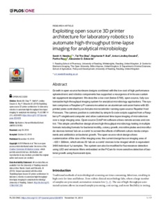 Needs, S. H. ORCID: https://orcid.org/0000-0003-3407-9637, Diep, T. T., Bull, S. P. ORCID: https://orcid.org/0000-0001-5129-1731, Lindley-Decaire, A., Ray, P. ORCID: https://orcid.org/0000-0001-8375-8279 and Edwards, A. D. ORCID: https://orcid.org/0000-0003-2369-989X (2019) Exploiting open source 3D printer architecture for laboratory robotics to automate high-throughput time-lapse imaging for analytical microbiology. PLOS ONE, 14 (11). e0224878. ISSN 1932-6203 doi: 10.1371/journal.pone.0224878
