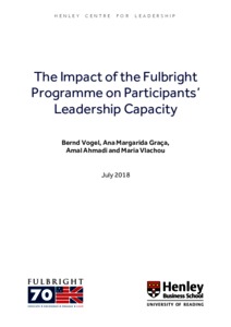 The Henley Centre for Leadership at Henley Business School, University of Reading, partnered with the US–UK Fulbright Commission, UK, to conduct a study with the aim of capturing and evaluating the impact that the experience of the Fulbright award has on its students’ and alumni’s leadership capacity – both during the award period and in the mid to long term, over the alumni’s careers. This research explores: the extent to which the Fulbright award helps to develop leadership capacity in programme members; what type of leadership capacity and tangible leadership behaviour is developed during the award; and how Fulbright students and alumni use this learning in their areas of responsibility and influence. The study utilises in-depth interviews with thirty-nine UK and US Fulbright students from a range of backgrounds and industries. In doing so, the study takes into account individual, contextual and programme factors that influence the impact of the Fulbright programme. The study derives the following headline insights: Part 2 shows that none of the interviewees had originally considered the enhancement of leadership capabilities to be part of the Fulbright experience. Nevertheless, the study consistently found that Fulbright influences the development of both personal growth in underlying developmental factors (such as core beliefs, confidence, experimentation, proactivity and identity) that function as generic precursors of leadership capabilities, and leadership capacities of attitudes, skills and behaviours. Such development builds not only on activities, events and processes directly provided by Fulbright, but also on the studies and experiences that are made possible by Fulbright through their award programmes. Fulbright alumni also collectively show a distinct understanding of what leadership means to them along a set of individual and relational attributes, as well as an understanding of leadership as a collective process with broad focus and outcomes (see Figure 1, page 8, for an overview). Part 3 highlights findings of how the Fulbright programme (pre, during and post award) influences the development of leadership capacity (see Figure 2, page 43, for an overview). The findings show: • how the Fulbright experience helped students to develop how they see themselves as leaders (heightened self-awareness; self-confidence; personal purpose and career trajectory; experimenting, autonomy and risk taking; proactivity; and resilience); • how the Fulbright experience helped students to develop leadership in situations of working with others (empathy; relationship skills; inspiring and involving others; speaking up; supporting others; and building confidence in others); • how the Fulbright experience developed students’ leadership regarding wider society and intercultural diversity (multicultural diversity and inclusion; legitimacy for voice and action; multidisciplinary diversity; tolerance; critical and independent inquiry; purposeful and outward-focused research; and humility and gratitude, for giving back to society). Furthermore, findings point to the impact of students’ changes in leadership capacity on their lives and careers. These findings revolve around students’ identity transformations, their personal and professional trajectories, and their continuous preference for experiences with multicultural contexts. The findings also revolve around Fulbright being a continuous resource with long-term impacts on inclusive, multicultural leadership capacity. Part 4 offers a set of distinct conclusions and recommendations separated into the following periods: • pre-programme – for example: encourage students who see themselves as a non-fit to apply; identify candidates’ motivation to experiment with leadership; sustain multi-layered diversity in cohorts • during programme – for example: create awareness of leadership learning at programme start; provide a Fulbright ‘philosophy of leadership’ • post-programme – for example: strategic shift of Fulbright activities to the post-award phase; leadership learning element of programme debrief; continuous post-programme reflexive activities for personal growth These conclusions provide a springboard to consider future initiatives that advance the leadership capacity outcome of the Fulbright journey (see Figure 3, page 46).