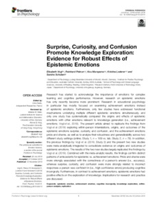 Vogl, E., Pekrun, R., Murayama, K., Loderer, K. and Schubert, S. (2019) Surprise, curiosity, and confusion promote knowledge exploration: evidence for robust effects of epistemic emotions. Frontiers in Psychology, 10. 2474. ISSN 1664-1078 doi: 10.3389/fpsyg.2019.02474