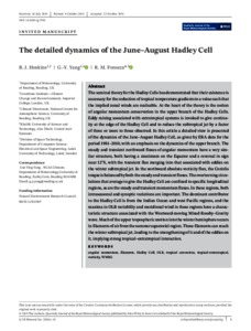 The seminal theory for the Hadley Cells has demonstrated that their existence is necessary for the reduction of tropical temperature gradients to a value such that the implied zonal winds are realisable. At the heart of the theory is the notion of angular momentum conservation in the upper branch of the Hadley Cells. Eddy mixing associated with extra‐tropical systems is invoked to give continuity at the edge of the Hadley Cell and to reduce the subtropical jet by a factor of 3 or more to those observed. In this paper a detailed view is presented of the dynamics of the June–August Hadley Cell, as given by ERA data for the period 1981–2010, with an emphasis on the dynamics of the upper branch. The steady and transient northward fluxes of angular momentum have a very similar structure, both having a maximum on the equator and a reversal in sign near 12°S, with the transient flux merging into that associated with eddies on the winter sub‐tropical jet. In the northward absolute vorticity flux, the Coriolis torque is balanced by both the steady and transient fluxes. The overturning circulations that average to give the Hadley Cell are confined to specific longitudinal regions, as are the steady and transient momentum fluxes. In these regions, both intra‐seasonal and synoptic variations are important. The dominant contributor to the Hadley Cell is from the Indian Ocean and W Pacific regions, and the maxima in OLR variability and meridional wind in these regions have a characteristic structure associated with the Westward‐moving Mixed Rossby‐Gravity wave. Much of the upper tropospheric motion into the winter hemisphere occurs in filaments of air from the summer equatorial region. These filaments can reach the winter sub‐tropical jet, leading to the strengthening of it and of the eddies on it, implying strong tropical‐extratropical interaction.