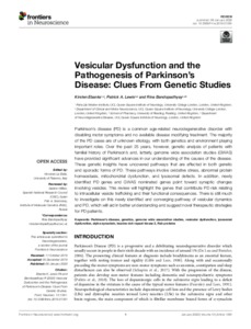 Ebanks, K., Lewis, P. A. and Bandopadhyay, R. (2020) Vesicular dysfunction and the pathogenesis of Parkinson's disease: clues from genetic studies. Frontiers in Neuroscience, 13. 1381. ISSN 1662-453X doi: 10.3389/fnins.2019.01381