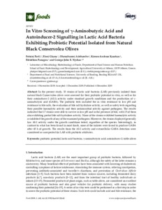 In the present study, 33 strains of lactic acid bacteria (LAB) previously isolated from natural black Conservolea olives were assessed for their probiotic potential in vitro, as well as for their autoinducer-2 (AI-2) activity under standard growth conditions and the production of γ-aminobutyric acid (GABA). The probiotic tests included the in vitro resistance to low pH and resistance to bile salts, the evaluation of bile salt hydrolase activity, as well as safety tests regarding their possible haemolytic activity and their antimicrobial activity against pathogens. The results indicated that 17 strains were able to survive in low pH and in the presence of bile, with 15 of them also exhibiting partial bile salt hydrolase activity. None of the strains exhibited haemolytic activity or inhibited the growth of any of the examined pathogens. Moreover, the strains displayed generally low AI-2 activity under the growth conditions tested, regardless of the species. Interestingly, in contrast to what has been found in most foods, none of the isolates were found to produce GABA after 48 h of growth. The results from the AI-2 activity and extracellular GABA detection were considered as unexpected for LAB with probiotic attributes.