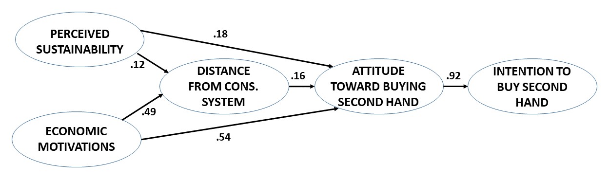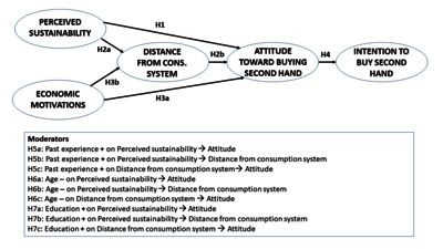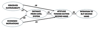 Sharing economy platforms are increasingly providing an effective means of connecting providers and users of secondhand goods. While media seem to emphasize that the trend of selling/buying secondhand has been growing due to the consolidation and development of P2P sharing platforms, a comprehensive identification of the antecedents of buying secondhand on sharing economy platforms is virtually missing. This study addresses this gap by 1) identifying different sets of motivations and attitudes leading consumers to adopt sharing economy platforms for secondhand buying; 2) testing a model on a sample of UK consumers in the context of P2P sharing platforms for secondhand clothing. The study reveals that there are three major antecedents of consumers’ attitude towards buying secondhand clothes on P2P sharing economy platforms: perceived sustainability, economic motivations, and taking a distance from the consumption system. Perceived sustainability and economic motivations influence positively attitude toward buying secondhand, as well as motivations in the form of distance from the consumption system. Attitude toward buying secondhand is positively influenced also by distance from the system and, in turn, has a strong positive influence on behavioral intention to buy secondhand clothes. Moreover, past experience of buying secondhand online has a positive moderating effect on the relationship between perceived sustainability and distance from the consumption system.