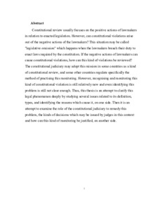 Constitutional review usually focuses on the positive actions of lawmakers in relation to enacted legislation. However, can constitutional violations arise out of the negative actions of the lawmakers? This situation may be called "legislative omission" which happens when the lawmakers breach their duty to enact laws required by the constitution. If the negative actions of lawmakers can cause constitutional violations, how can this kind of violations be reviewed? The constitutional judiciary may adopt this mission in some countries as a kind of constitutional review, and some other countries regulate specifically the method of practising this monitoring. However, recognising and monitoring this kind of constitutional violation is still relatively new and even identifying this problem is still not clear enough. Thus, this thesis is an attempt to clarify this legal phenomenon deeply by studying several issues related to its definition, types, and identifying the reasons which cause it, on one side. Then it is an attempt to examine the role of the constitutional judiciary to remedy this problem, the kinds of decisions which may be issued by judges in this context and how can this kind of monitoring be justified, on another side.