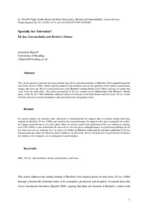 This article analyses tensions between medium specificity and intermediality in Beckett’s first original drama for television, Eh Joe (1966), which exploits features of the medium such as the spatiality of the studio, monochrome images and close-up. But its visual motifs also echo Beckett’s cinema debut, Film (1964), and uses of sound and voice from his radio plays. The public promotion of Eh Joe centred on its relationships with Beckett’s theatre plays, while Eh Joe’s first audiences adduced frames of reference from both theatre and television. Eh Joe works with the porosity of media boundaries and performatively renegotiates them.