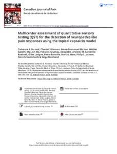 Background: The use of quantitative sensory testing (QST) in multicenter studies has been quite limited, due in part to lack of standardized procedures among centers. Aim: The aim of this study was to assess the application of the capsaicin pain model as a surrogate experimental human model of neuropathic pain in different centers and verify the variation in reports of QST measures across centers. Methods: A multicenter study conducted by the Quebec Pain Research Network in six laboratories allowed the evaluation of nine QST parameters in 60 healthy subjects treated with topical capsaicin to model unilateral pain and allodynia. The same measurements (without capsaicin) were taken in 20 patients with chronic neuropathic pain recruited from an independent pain clinic. Results: Results revealed that six parameters detected a significant difference between the capsaicin-treated and the control skin areas: (1) cold detection threshold (CDT) and (2) cold pain threshold (CPT) are lower on the capsaicin-treated side, indicating a decreased in cold sensitivity; (3) heat pain threshold (HPT) was lower on the capsaicin-treated side in healthy subjects, suggesting an increased heat pain sensitivity; (4) dynamic mechanical allodynia (DMA); (5) mechanical pain after two stimulations (MPS2); and (6) mechanical pain summation after ten stimulations (MPS10), are increased on the capsaicin-treated side, suggesting an increased in mechanical pain (P < 0.002). CDT, CPT and HPT showed comparable effects across all six centers, with CPT and HPT demonstrating the best sensitivity. Data from the patients showed significant difference between affected and unaffected body side but only with CDT. Conclusion: These results provide further support for the application of QST in multicenter studies examining normal and pathological pain responses.