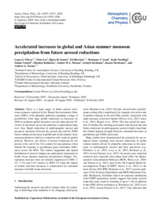 Wilcox, L. J. ORCID: https://orcid.org/0000-0001-5691-1493, Liu, Z., Samset, B. H., Hawkins, E. ORCID: https://orcid.org/0000-0001-9477-3677, Lund, M. T., Nordling, K., Undorf, S., Bollasina, M., Ekman, A. M. L., Krishnan, S., Merikanto, J. and Turner, A. G. ORCID: https://orcid.org/0000-0002-0642-6876 (2020) Accelerated increases in global and Asian summer monsoon precipitation from future aerosol reductions. Atmospheric Chemistry and Physics, 20 (20). pp. 11955-11977. ISSN 1680-7316 doi: 10.5194/acp-20-11955-2020