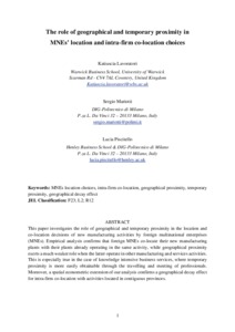 This paper investigates the role of geographical and temporary proximity in the location and co-location decisions of new manufacturing activities by foreign multinational enterprises (MNEs). Empirical analysis confirms that foreign MNEs co-locate their new manufacturing plants with their plants already operating in the same activity, while geographical proximity exerts a much weaker role when the latter operate in other manufacturing and services activities. This is especially true in the case of knowledge intensive business services, where temporary proximity is more easily obtainable through the travelling and meeting of professionals. Moreover, a spatial econometric extension of our analysis confirms a geographical decay effect for intra-firm co-location with activities located in contiguous provinces.