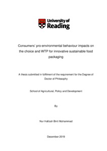 Muhammad, N. H. B. (2019) Consumers’ pro-environmental behaviour impacts on the choice and WTP for innovative sustainable food packaging. PhD thesis, University of Reading. doi: 10.48683/1926.00088937